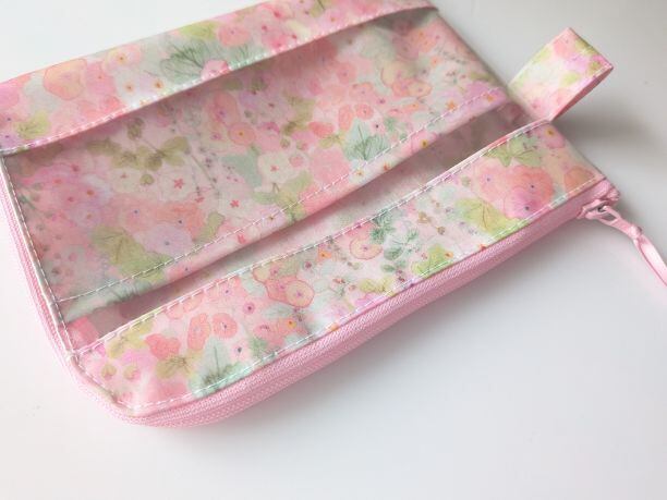 仕切り付きA6 L字ファスナー お薬手帳 クリアポーチ ホリーホックス リバティ ラミネート ♡典型的なイングリッシュガーデンに咲く沢山のタチアオイからインスピレーションを受け水彩で描かれた柄 | リバティ×リバティ| 大人可愛いポーチ | オリジナルポーチ | 日本製