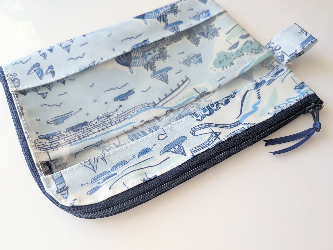 仕切り付きA6 L字ファスナー お薬手帳 クリアポーチ アドベンチャーコースト リバティ ラミネート ♡北ウェールズにある美しいイタリア風の村、ポートメイリオンの壮大な景観とパノラマビューからインスピレーション | リバティ×リバティ| 大人可愛いポーチ | オリジナルポーチ | 日本製