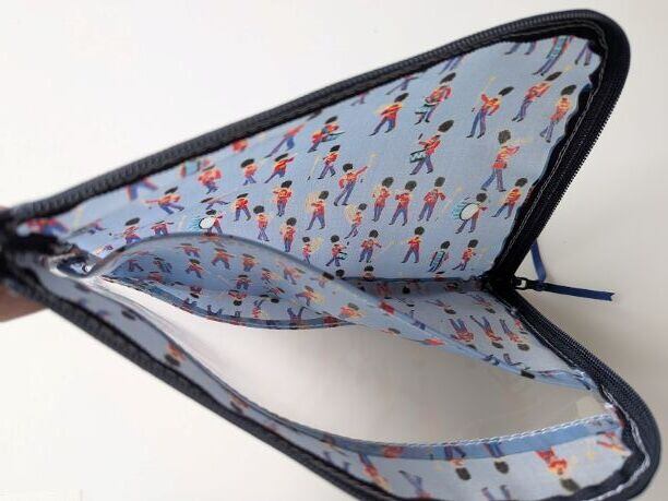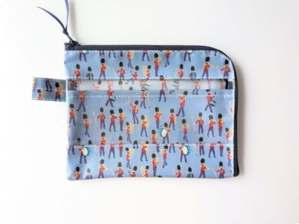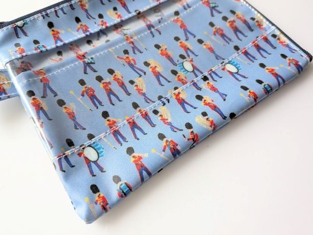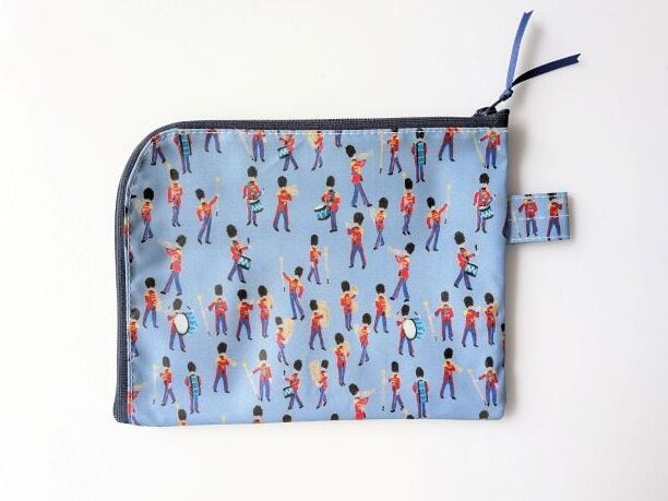 仕切り付きA6 L字ファスナー お薬手帳 クリアポーチ ミュージカルマーチ リバティ ラミネート ♡イギリスの伝統的な象徴である軍旗分列行進式。 軍の音楽隊をクレヨンでチャーミングに描きました | リバティ×リバティ| 大人可愛いポーチ | オリジナルポーチ | 日本製