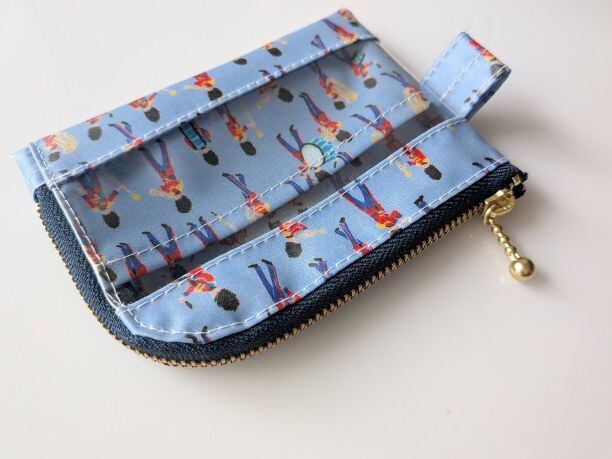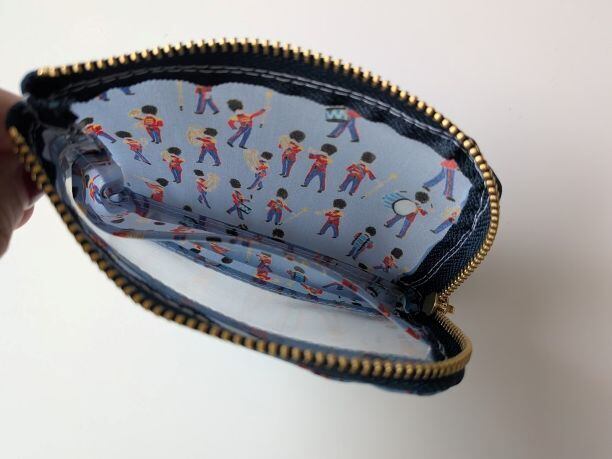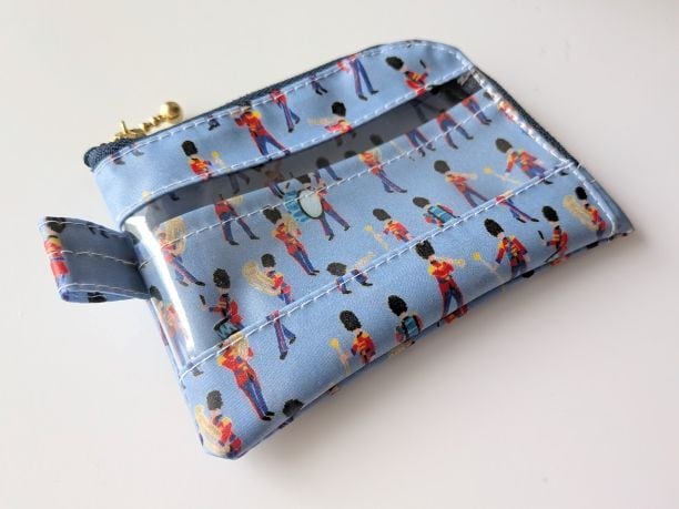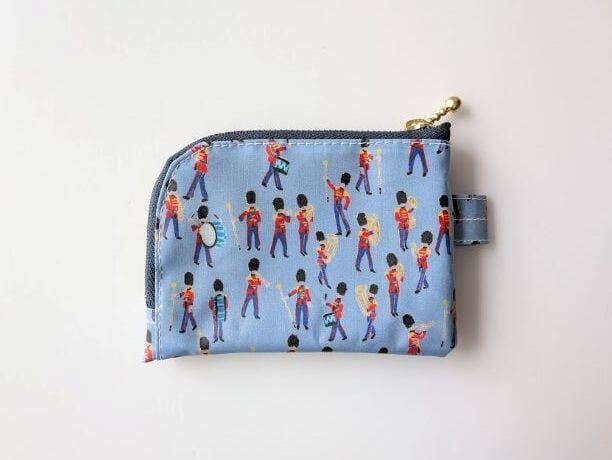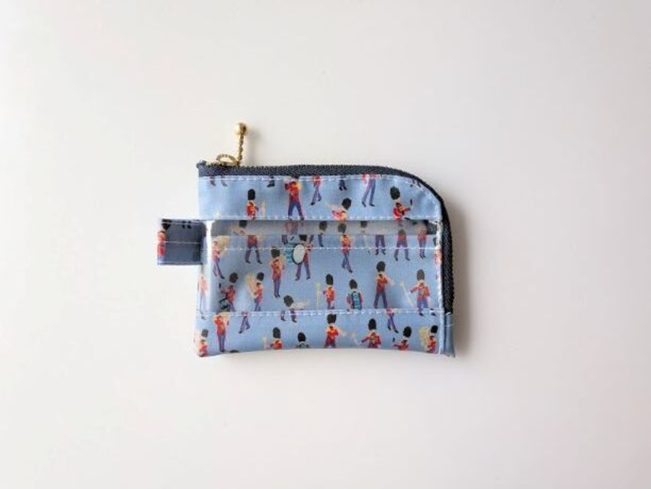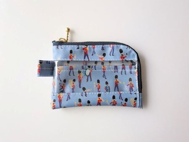 仕切り付きA7 L字ファスナー クリアポーチ ミュージカルマーチ リバティ ラミネート カードサイズ ♡イギリスの伝統的な象徴である軍旗分列行進式。軍の音楽隊をクレヨンでチャーミングに描きました | リバティ×リバティ| 大人可愛いポーチ | オリジナルポーチ | 日本製