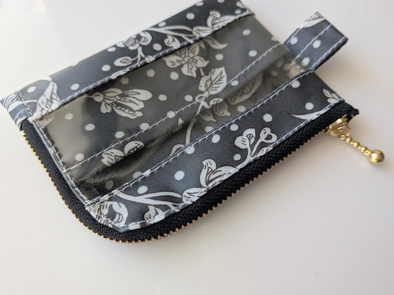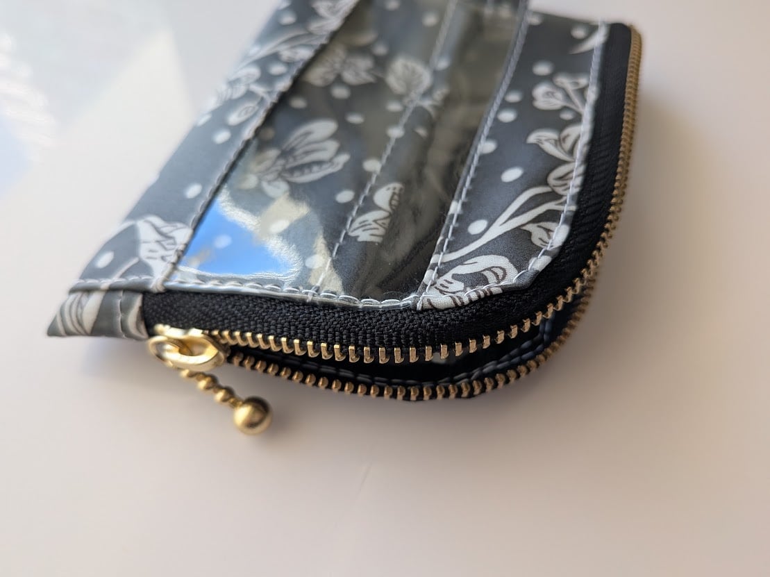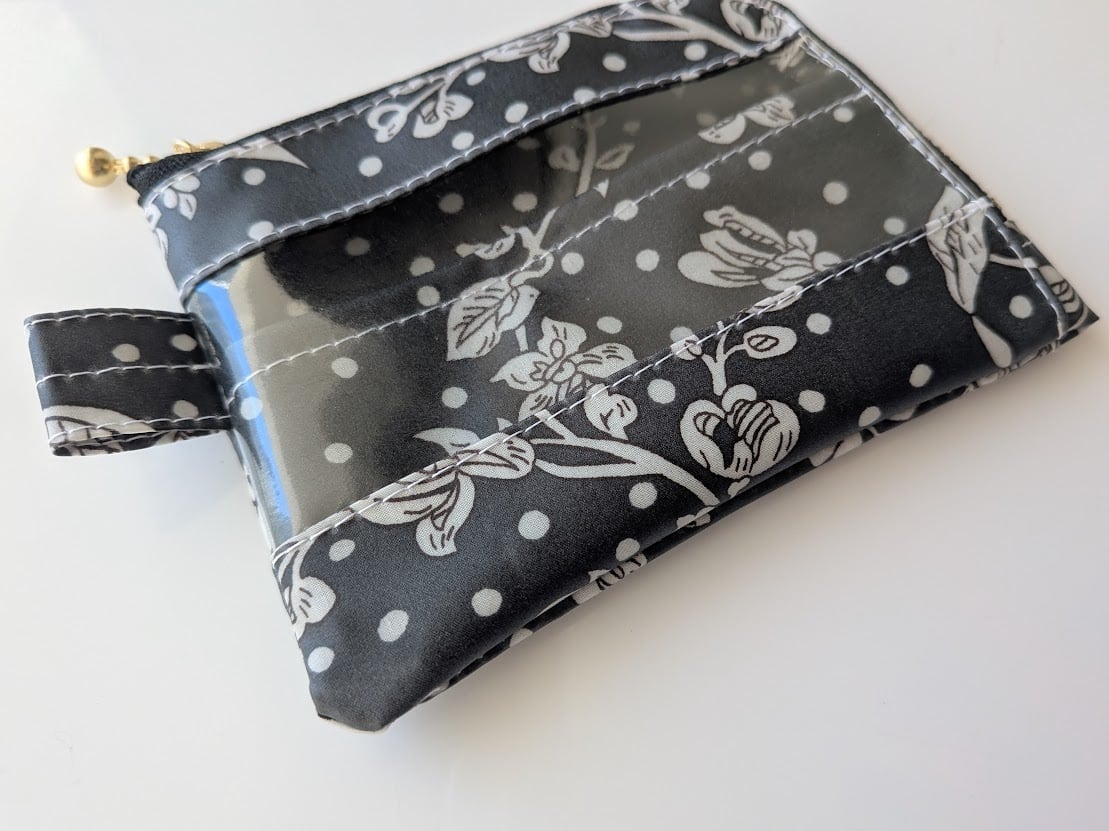 仕切り付きA7 L字ファスナー クリアポーチ マロリー リバティ ラミネート カードサイズ ♡水玉のベースデザインに手描きで、東洋の花々が上に向かってレイアウトされた柄 | リバティ×リバティ| 大人可愛いポーチ | オリジナルポーチ | 日本製