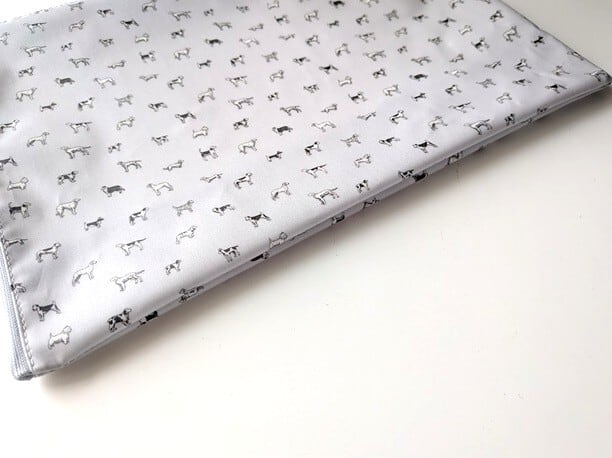 【アウトレット】A4 L字ファスナー クリアポーチ マンズベストフレンド リバティ ラミネート ♡詳細に描かれた犬のイラストが間隔をあけてレイアウトされています